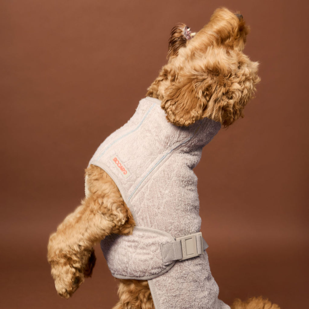 Vores superabsorberende tørredækken er perfekt efter bad, regn, svømmetur eller en mudret dag i marken. Hemmeligheden bag den effektive sugeevne er vores Wet2Dry-teknologi, som er udarbejdet efter flere års research og tests med målet om at skabe det mest absorberende materiale, der samtidig er lugtfri, holdbart og behageligt for hunden at have på.