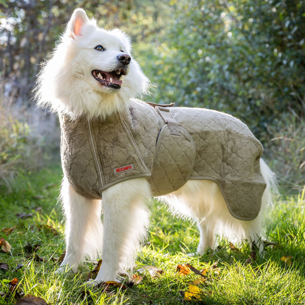 For at køle din hund ned: Gennemblød tørredragten i koldt vand, vrid overskydende vand ud af dækkenet og giv hunden den på i max 20-30 minutter. Husk, hold øje med hunden.